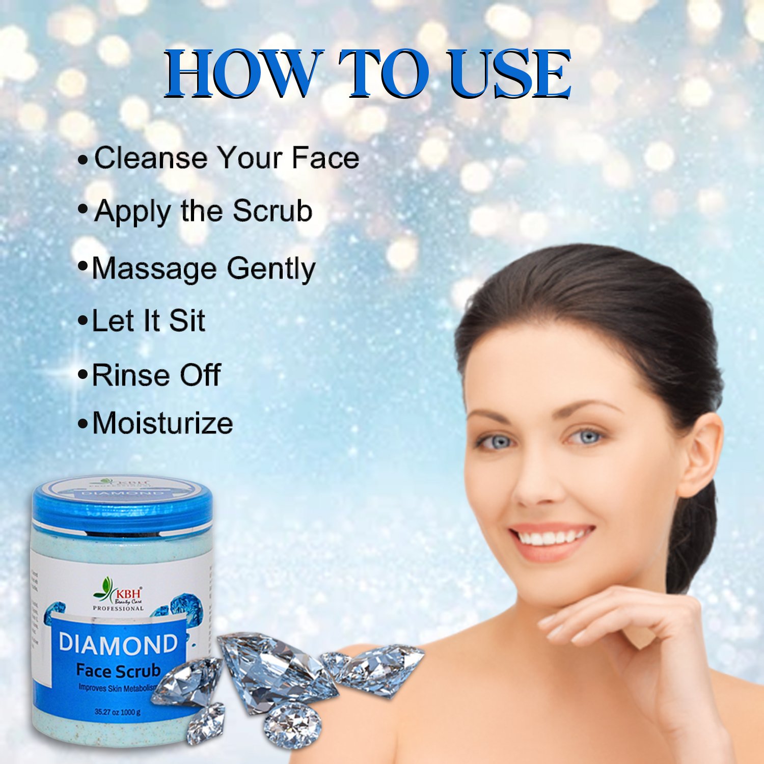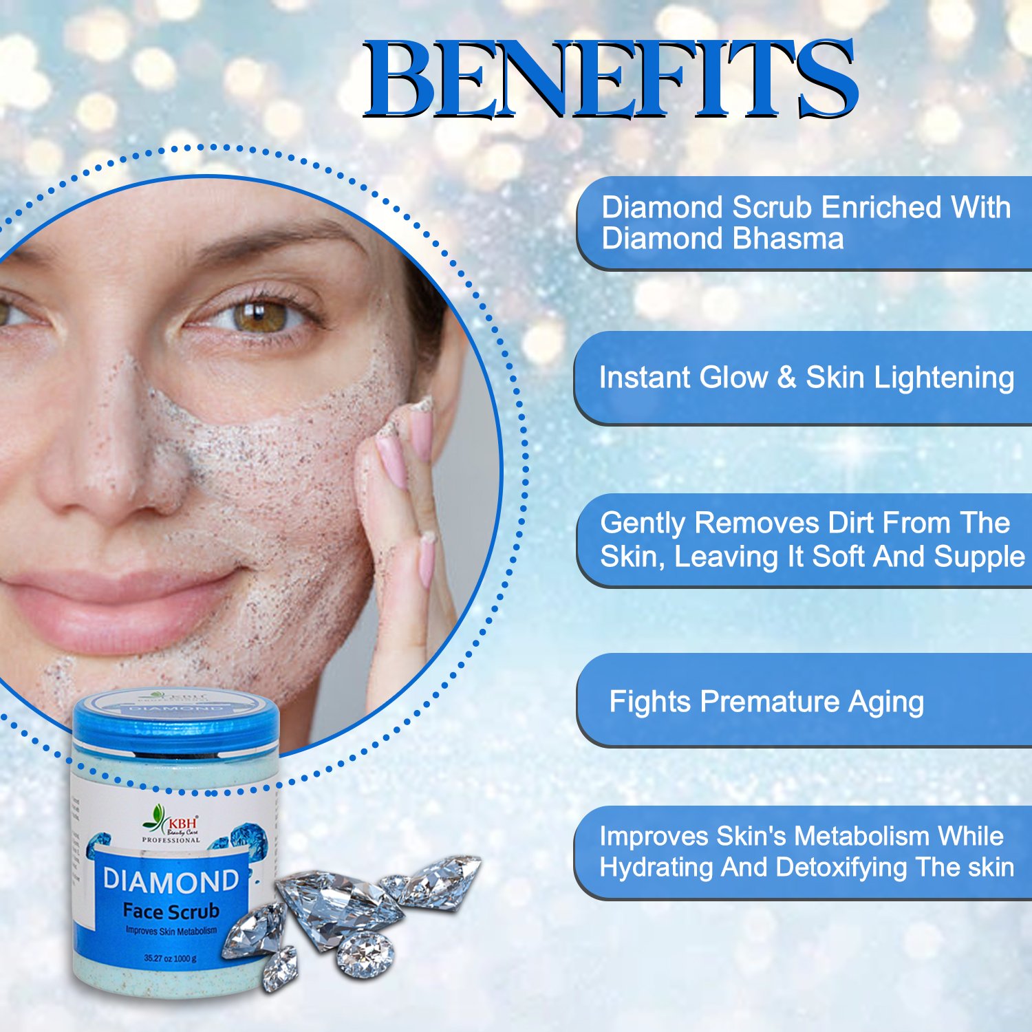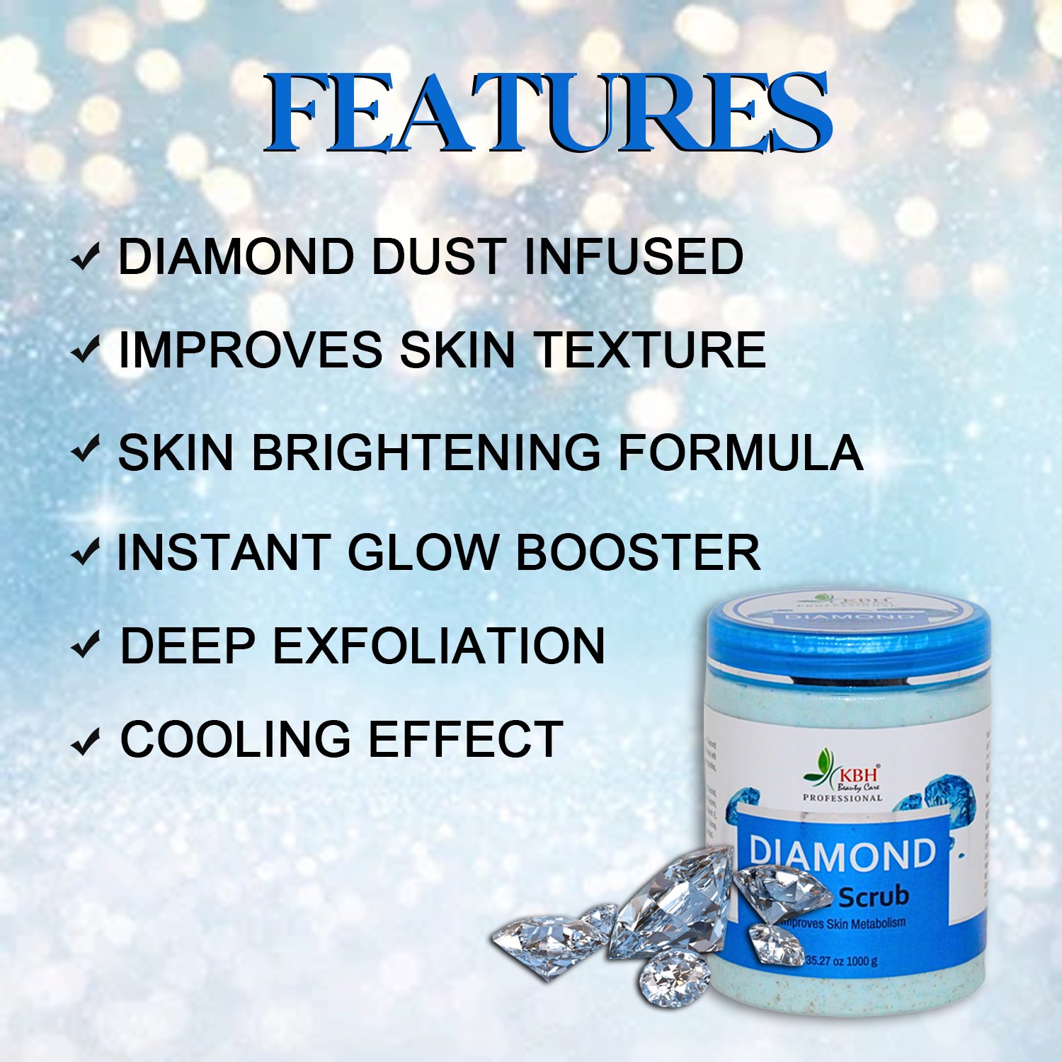 The Diamond Face Scrub is formulated with real diamond dust and skin-nourishing ingredients that help gently exfoliate dead skin cells, remove dullness, and improve skin texture. It cleanses and revitalizes the skin, leaving it soft, smooth, and luminous. Ideal for regular use to achieve a sparkling, youthful glow.