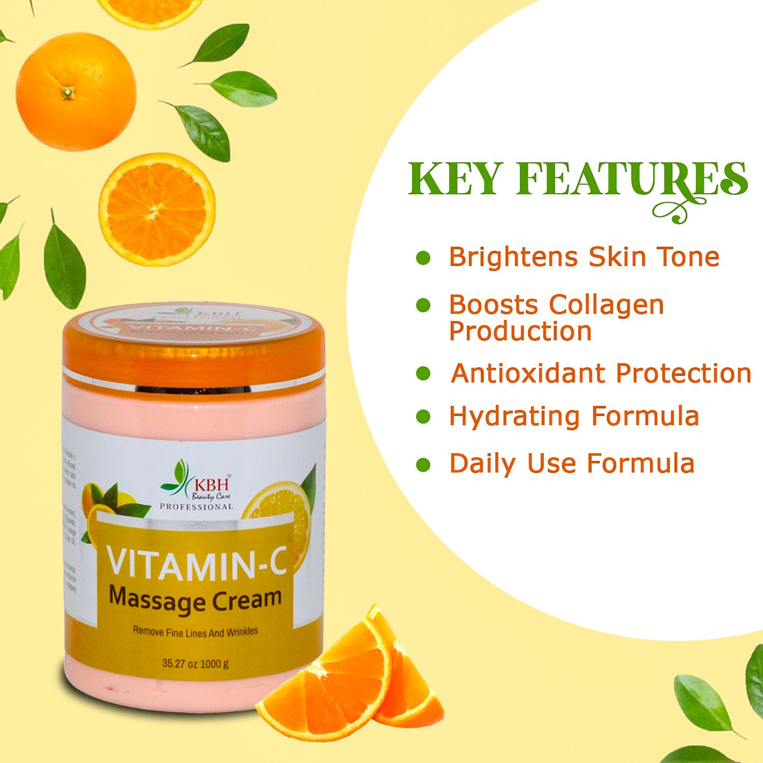 The Vitamin C Massage Cream is formulated with Vitamin C and skin-nourishing ingredients that help reduce dullness, improve skin tone, and enhance radiance during massage. It deeply hydrates, revitalizes, and leaves the skin soft, smooth, and glowing. Suitable for all skin types and ideal for regular use.